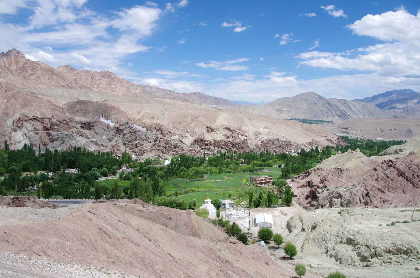 Étapes : Petit déjeuner puis journée consacrée à la visite de Leh et notamment du palais Stok, où s'établit la famille royale bannie après l'annexion du Ladakh par le maharajah du Cachemire en 1837. Visite du musée recelant une très belle collection de costumes et bijoux royaux et de thangkas (peintures sur tissu). Déjeuner puis visite d'une école avant de finir l'après-midi par une promenade dans le bazar de Chang Gali et d'assister au coucher du soleil sur la vallée de l'Indus et la chaîne montagneuse de Stok depuis le stupa Shanti. Dîner et nuit à l'hôtel.