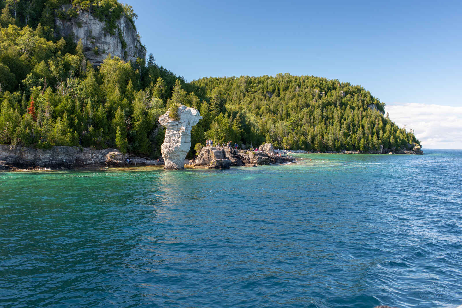 Rendez-vous matinal à South Baymouth et embarquement à bord du ferry qui navigue sur les eaux bleu vif de la baie Georgienne, et vous mène à Tobermory à travers le merveilleux parc marin national Fathom Five. La clarté exceptionnelle de l’eau fait de cette aire marine protégée la Mecque des plongeurs autonomes qui peuvent explorer à loisir grottes côtières et surtout une vingtaine d’épaves particulièrement bien préservées, gisant sur les hauts-fonds. Si vous désirez rester au sec, des bateaux à fond transparent, partant du port de Tobermory, offrent des vues fantastiques sur la zone des épaves avant de faire le tour des îles préservées du parc, dont l’île Flowerpot est le joyau. Vous pouvez l’atteindre également en zodiac et partir flâner ensuite sur ses sentiers balisés qui vous mèneront aux falaises côtières, desquelles vous pourrez observer les éperons rocheux érodés, formant d’étonnantes sculptures naturelles en pot de fleurs, qui donnent son nom à l’île.