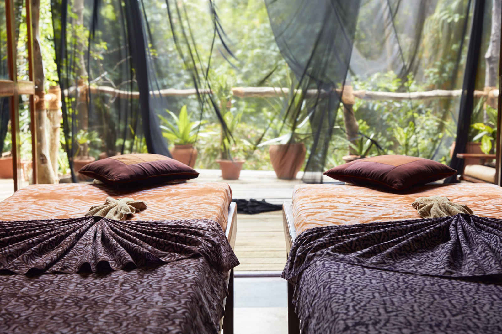 1 tente suite plage (73 m²) et 1 tente suite jungle (83 m²) sont aménagées avec terrasse, piscine privée et offrent en plus un service en chambre